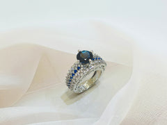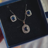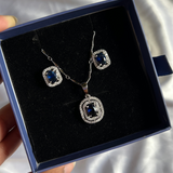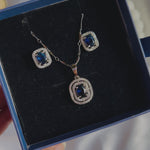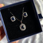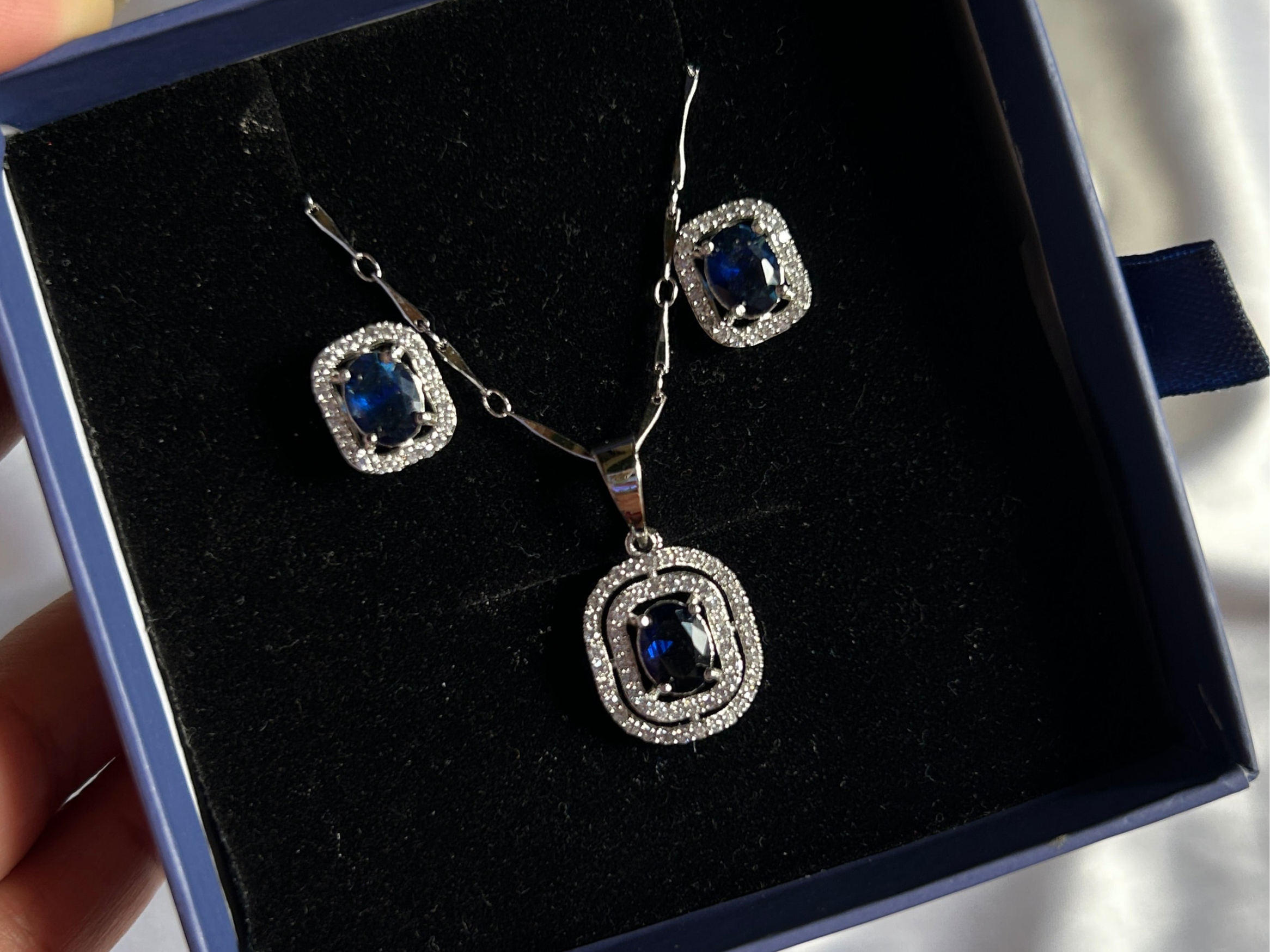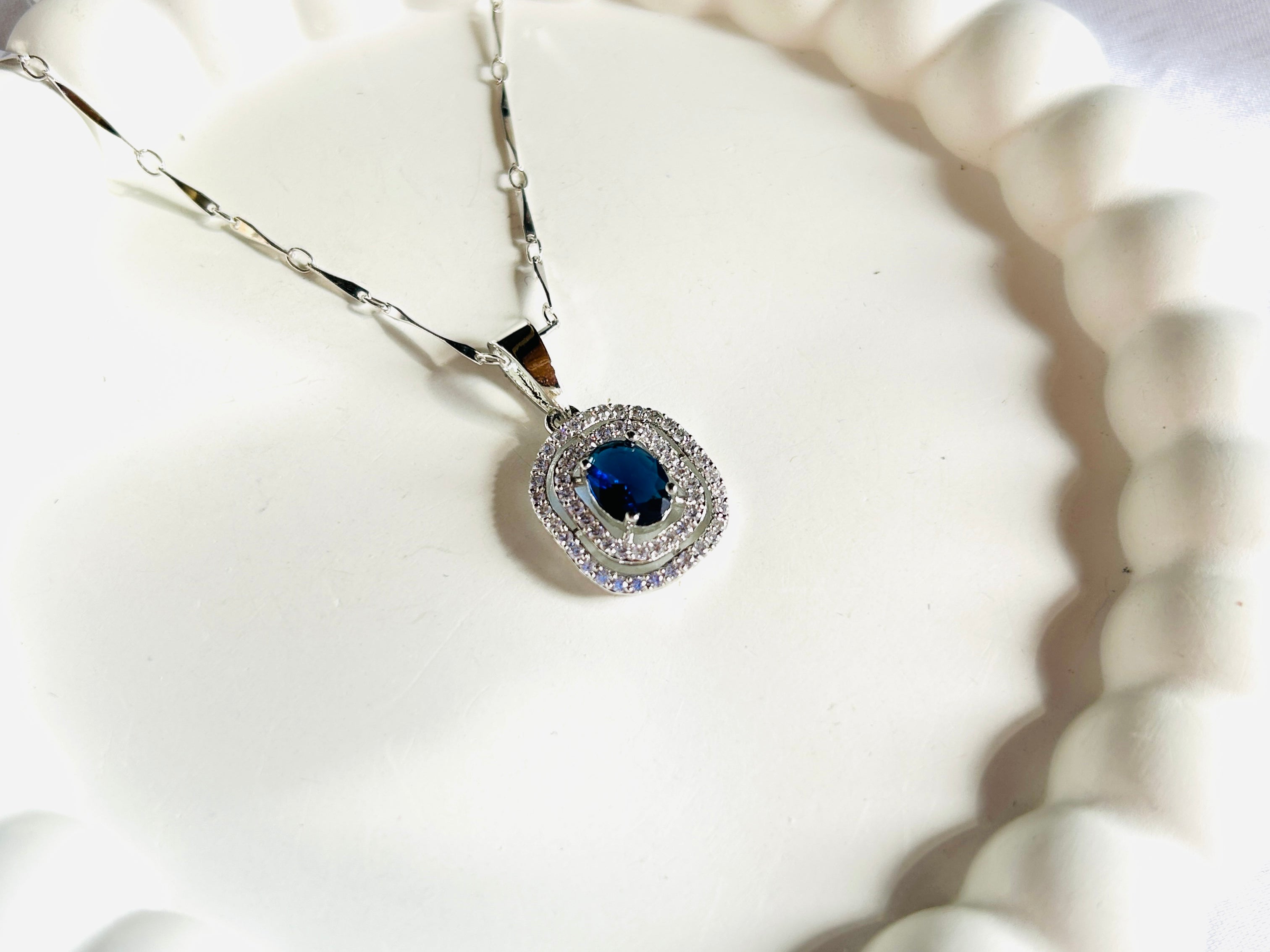 Our blue Stone Pendant Set is a perfect blend of traditional and contemporary aesthetics, featuring a stunning blue stone pendant that will catch the eye of anyone in the room. The rhodium polish gives it a sleek and polished look that will add a touch of sophistication to any outfit.