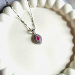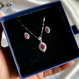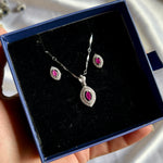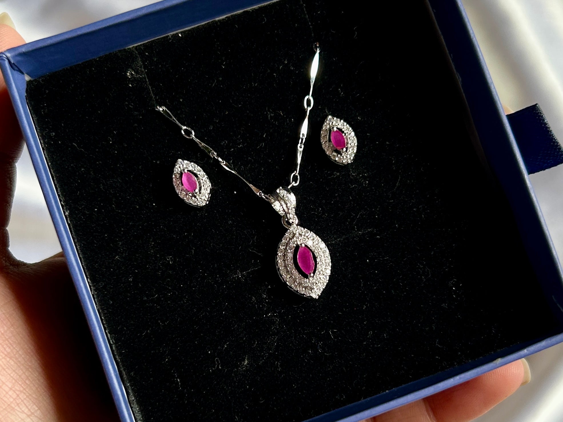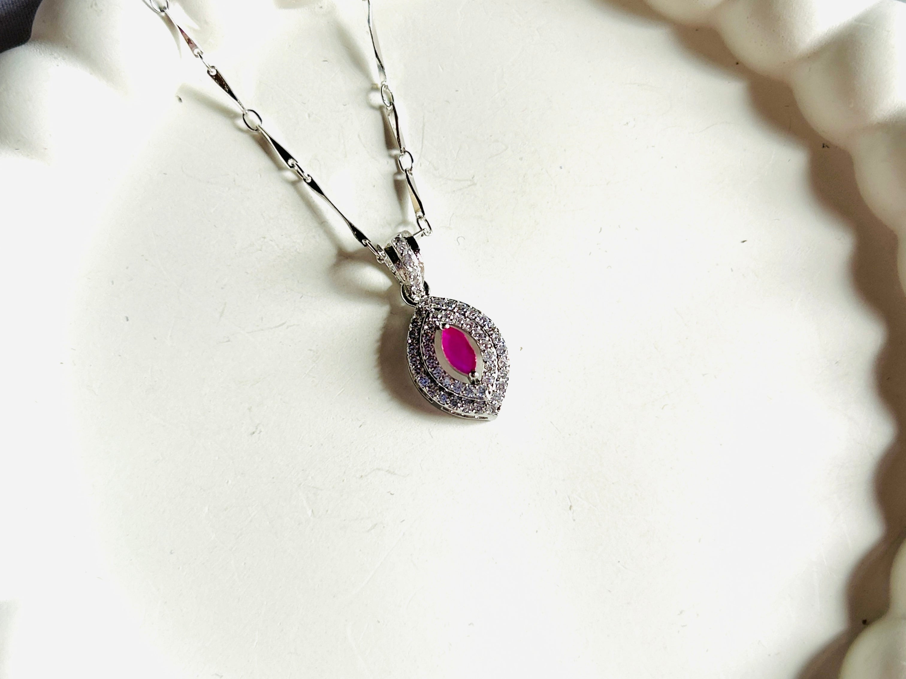 Our pink Stone Pendant Set is a perfect blend of traditional and contemporary aesthetics, featuring a stunning pink stone pendant that will catch the eye of anyone in the room. The rhodium polish gives it a sleek and polished look that will add a touch of sophistication to any outfit.