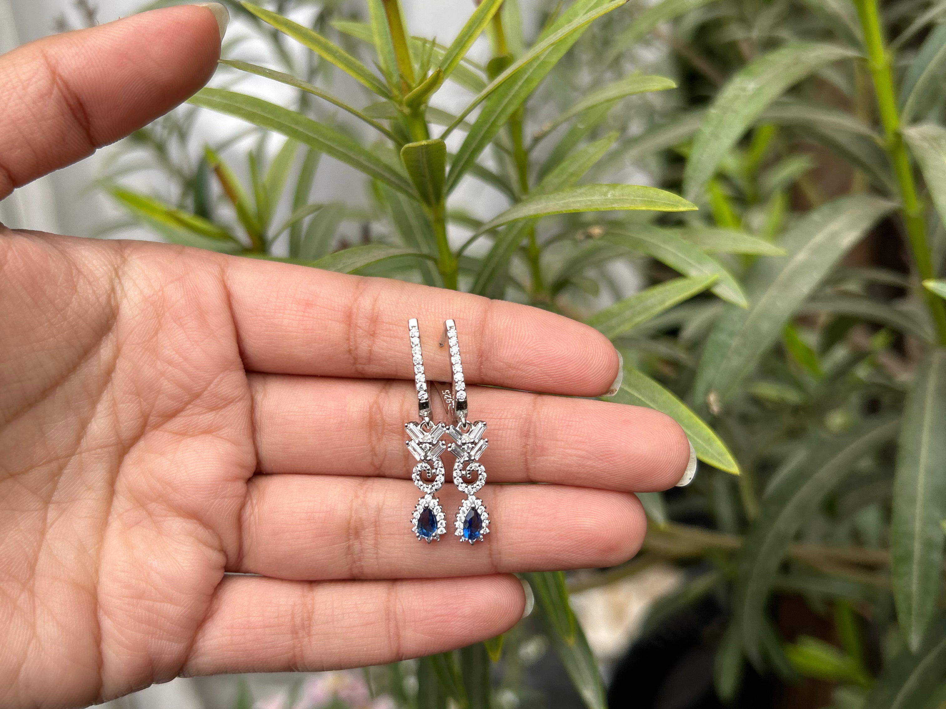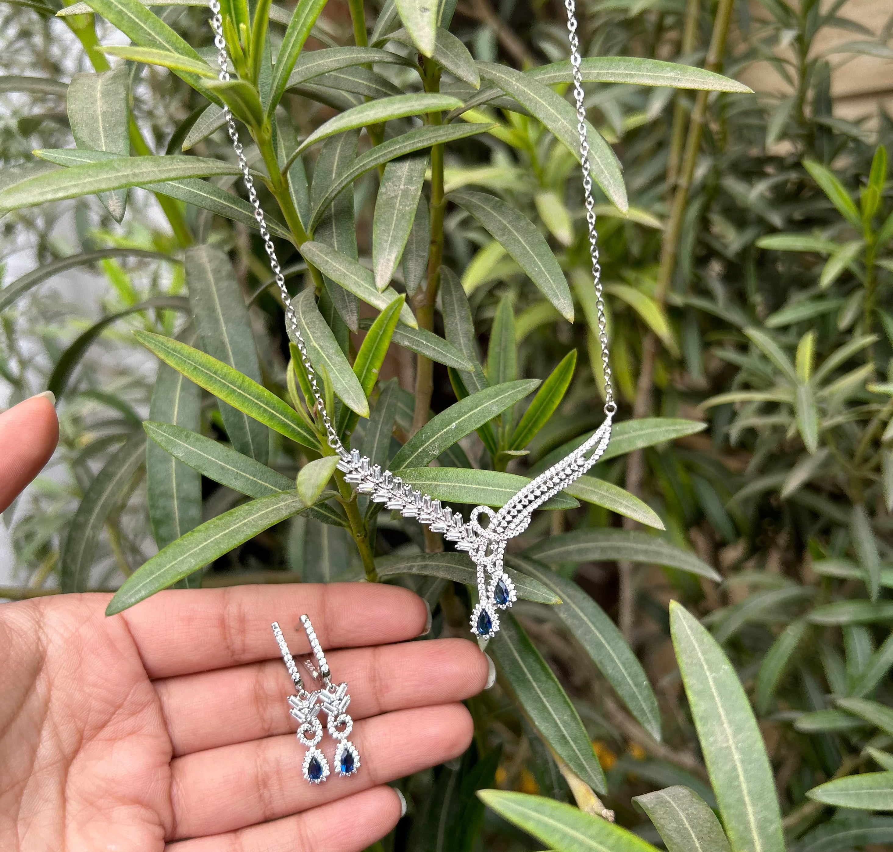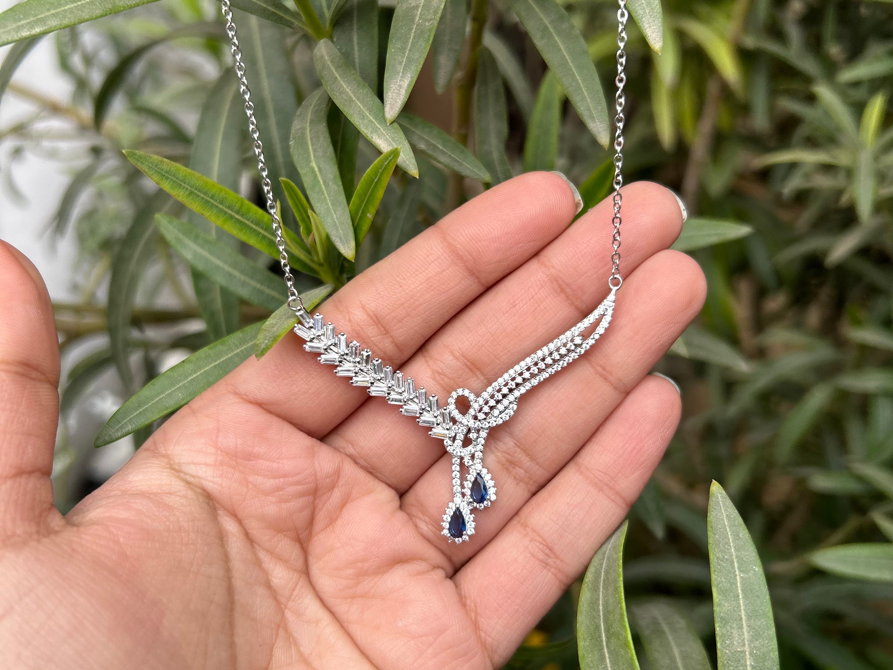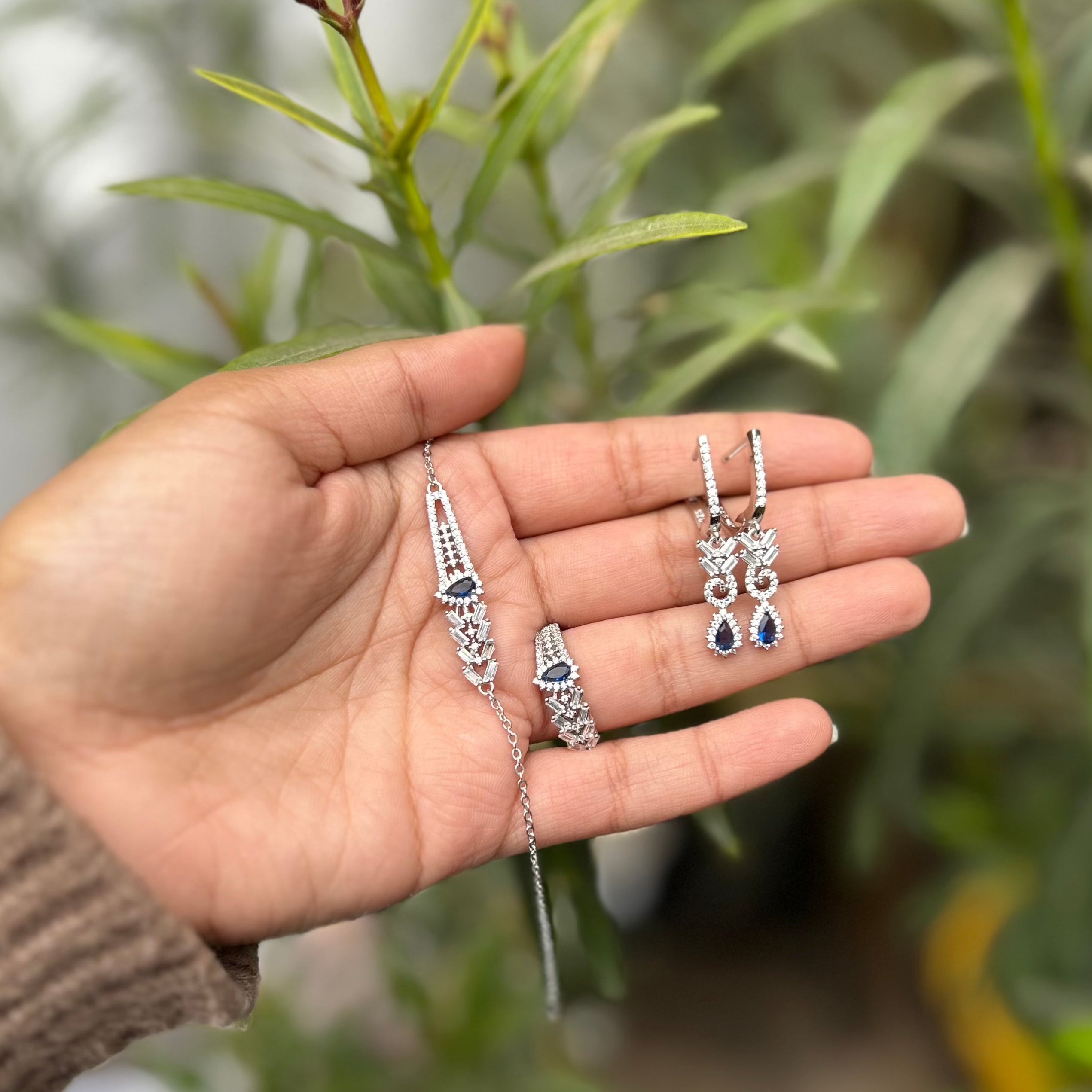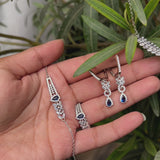 Introducing our exquisite Sterling Silver Jewelry Set, a dazzling ensemble designed to elevate your style with timeless elegance. This meticulously crafted set includes a stunning necklace, a pair of earrings, a delicate bracelet, and an enchanting ring, all adorned with brilliant cubic zirconia stones and blue stones resembling sapphires .