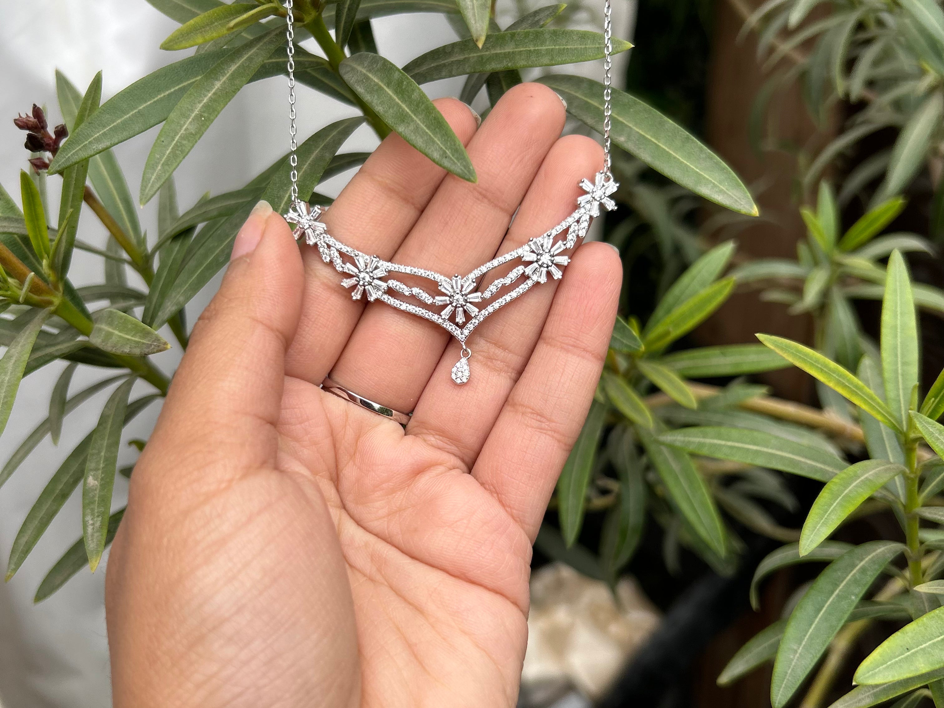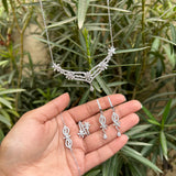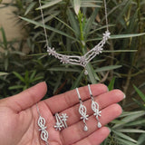 Immerse yourself in the timeless beauty of sterling silver, meticulously crafted to embody sophistication and enduring style. The centerpiece of this set is a graceful necklace that delicately drapes around the neck, showcasing an exquisite arrangement of sparkling cubic zirconia accents. Paired with matching earrings, this set effortlessly adds a touch of glamour to any occasion.