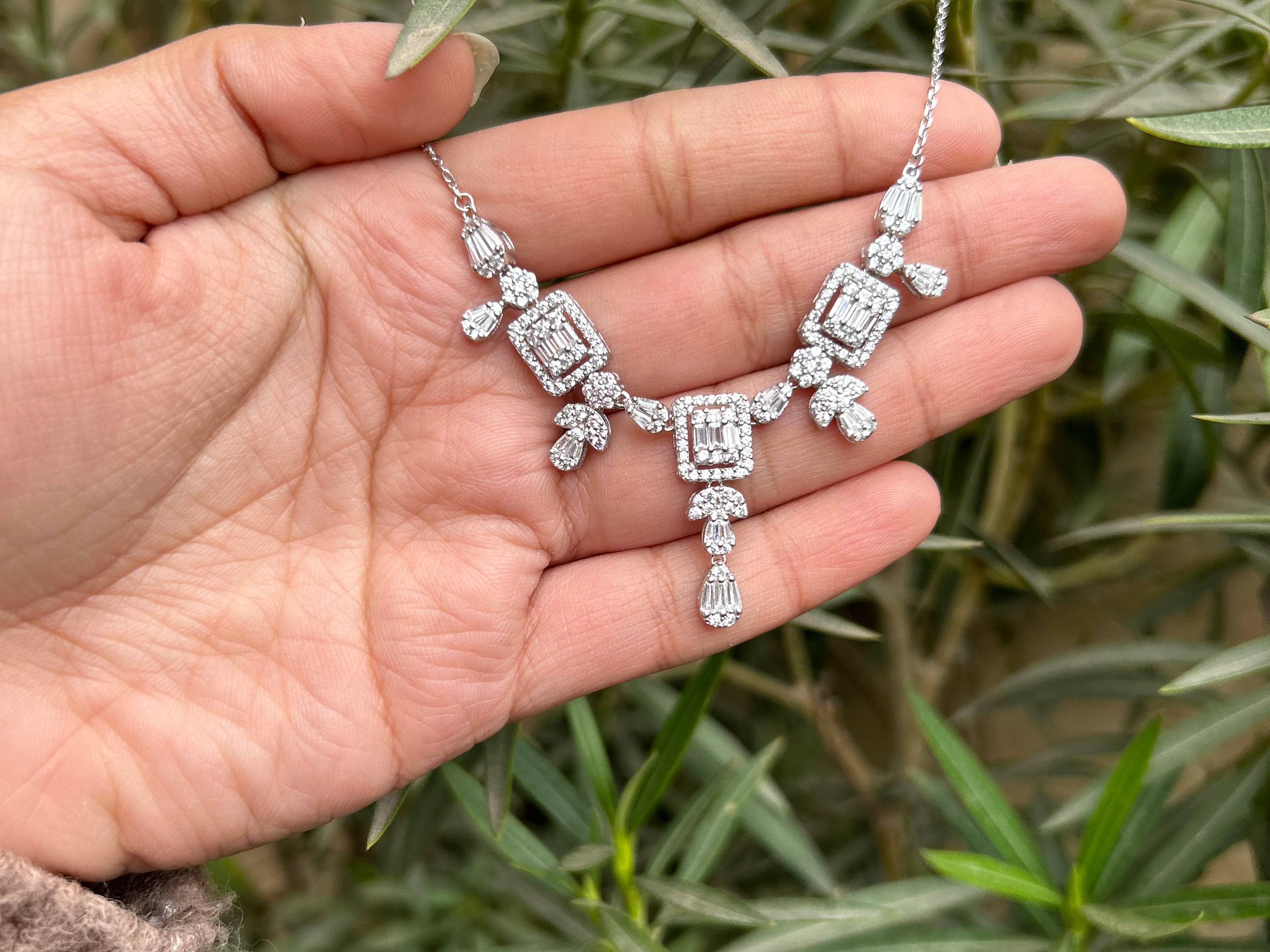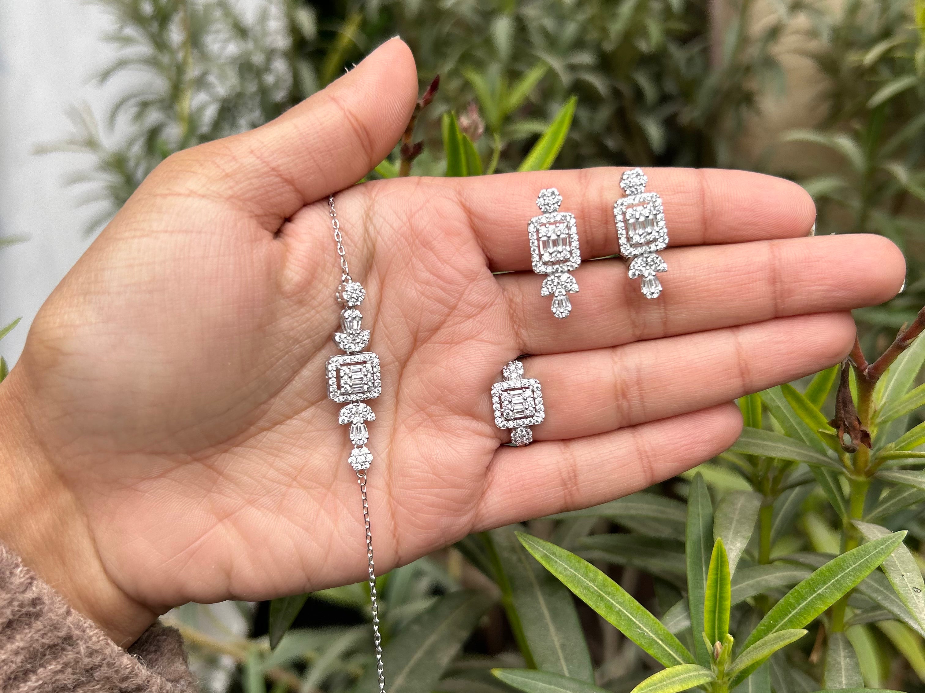 Introducing our exquisite Sterling Silver Jewelry Set, a dazzling ensemble designed to elevate your style with timeless elegance. This meticulously crafted set includes a stunning necklace, a pair of earrings, a delicate bracelet, and an enchanting ring, all adorned with brilliant cubic zirconia stones which looks exactly like diamonds.