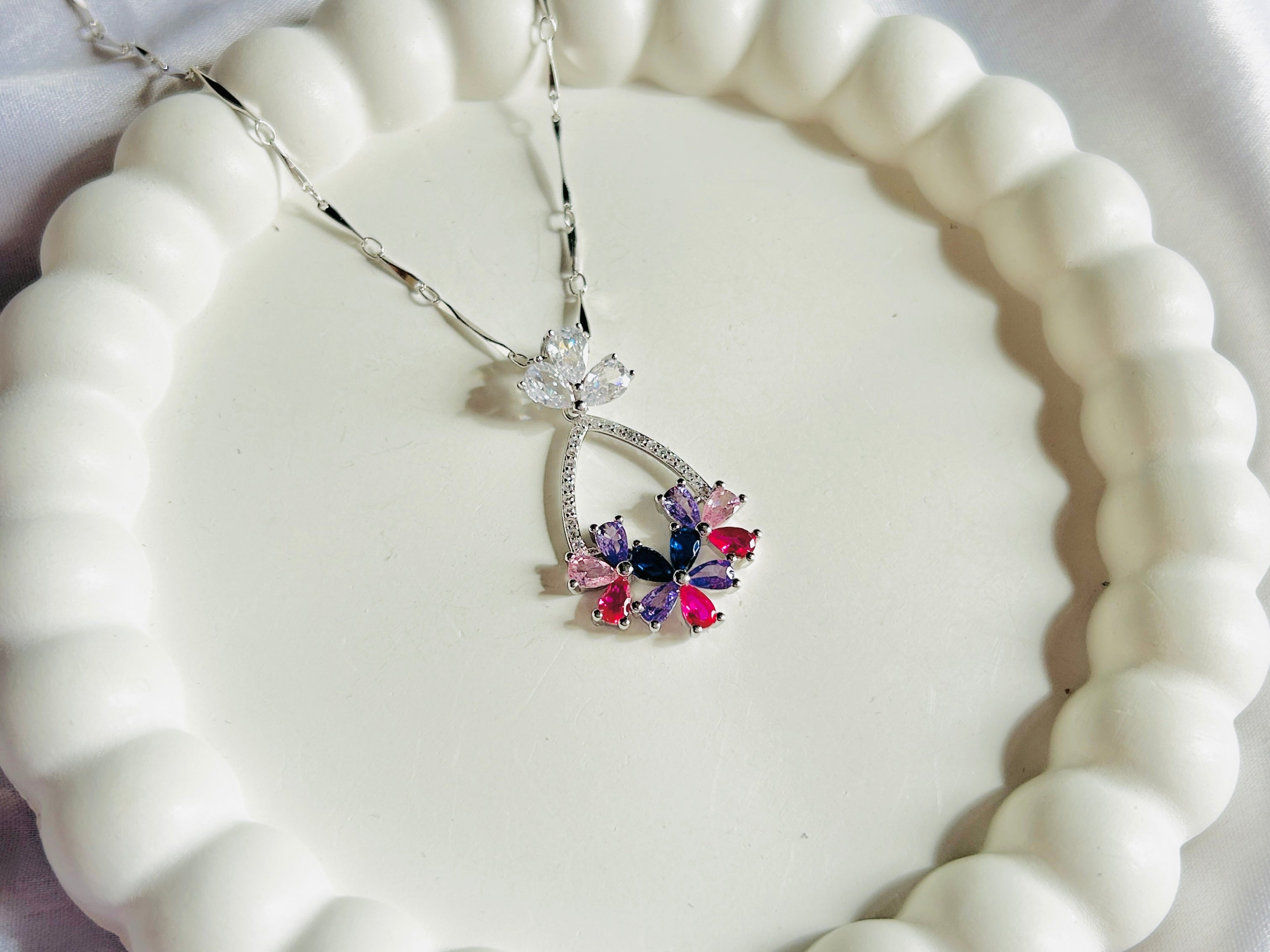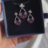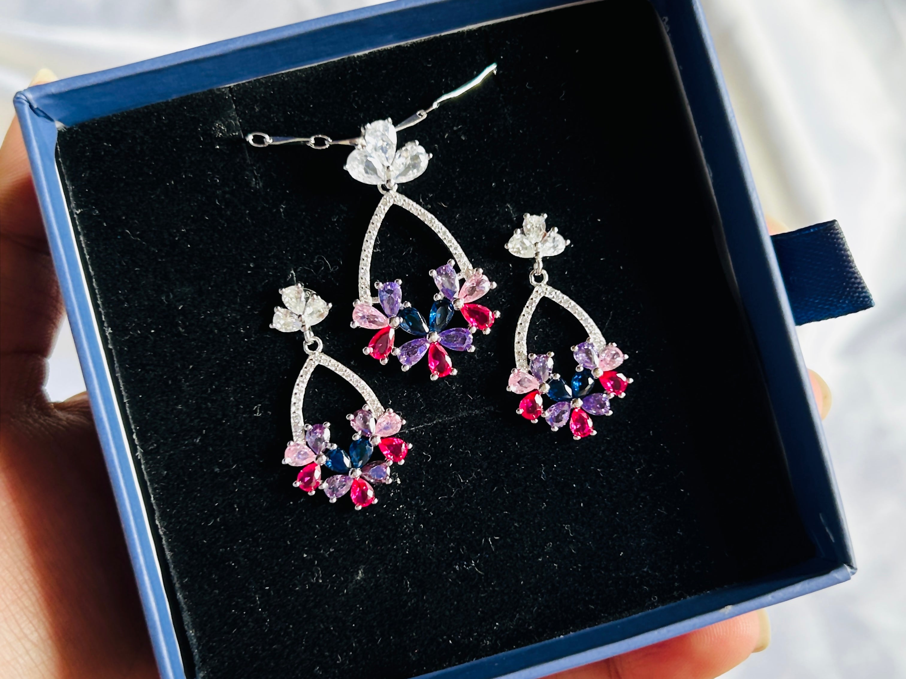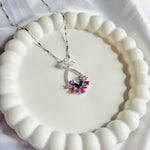 Our Rainbow Cz Stone Pendant Set is a perfect blend of traditional and contemporary aesthetics, featuring a stunning cut stone design in rainbow multicolored pendant that will catch the eye of anyone in the room. The rhodium polish gives it a sleek and polished look that will add a touch of sophistication to any outfit.